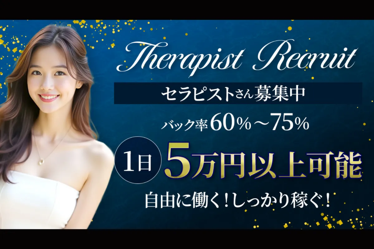【30代中心の大人セラピストさん活躍中】開業以来「指名が取れなければ稼げない」という考えのもと、経験問わず多くの人気セラピストさんを育て上げてきた女性オーナーのお店。過剰サービス無しで指名を掴み取る接客術を学んで、頑張りがしっかり稼ぎに繋がる喜びを感じてみませんか?