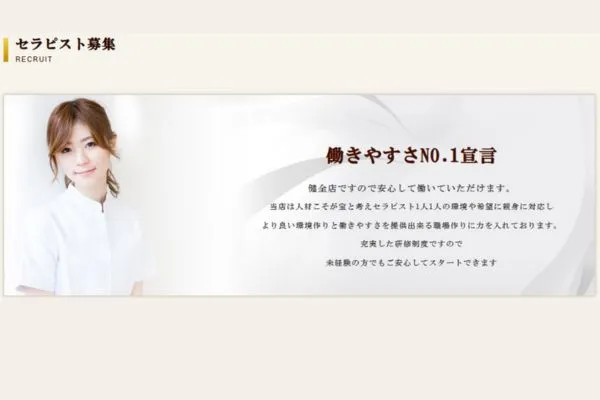 30代・40代のセラピストさんが活躍中のお店です。一日4時間からOK、ライフスタイルに合わせた働き方を応援します。完全歩合制50~80%バック、頑張った分だけお給料がUPするシステムです!