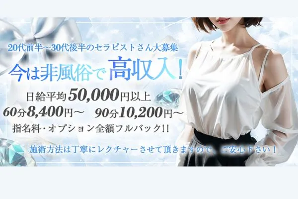 健全なお店で真面目に働いて、安全に高収入を目指しませんか!楽しくお話しすることが得意な方、アロマエステやヒーリングのお仕事に興味がある方、大歓迎です。週1日~勤務OKですので無理せずマイペースで出勤できます。アリバイ工作も万全です。セラピストさん専用駐車場があり、マイカー通勤OKです。