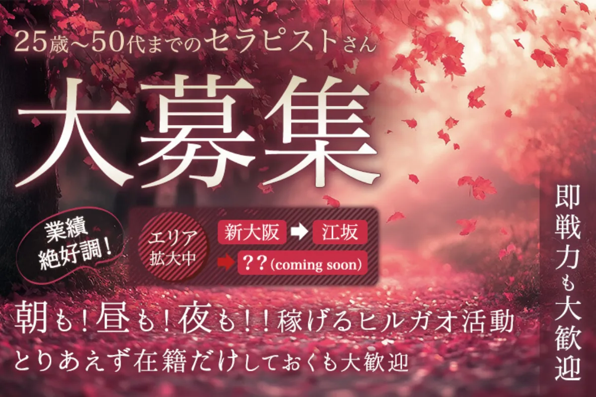 【30代・40代セラピストさん活躍中!!】朝も昼も夜も稼げる大人セラピスト専門店です。90分で8,000円~11,000円の高バック+指名料でしっかり稼げるところが魅力の一つ♪ただ稼げるだけでなく、客層、環境、安定も重視し、長く安心して稼げる環境づくりを徹底!!突然のお休みや出勤にも柔軟に対応◎