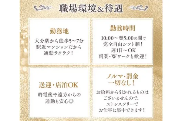 セラピストさん第一主義でサポートします!業界トップクラスの高歩合率、待機保証制度あり。大分駅近で通勤も便利、待機中は快適な個室でゆっくり休めますよ♪お店では30代が活躍中!主婦・未経験者歓迎です。