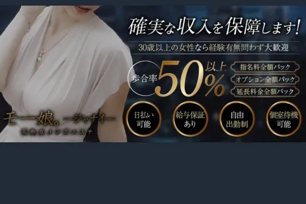 30代を中心に40代のセラピストさんも活躍している熟女専門店です。マッサージ・エステなどの経験者優遇、未経験者も大歓迎♪歩合は55%~オプションや指名料は全額バックです。給与保証があるのでお給料ゼロはありません。自信をもって明るく接客してください!