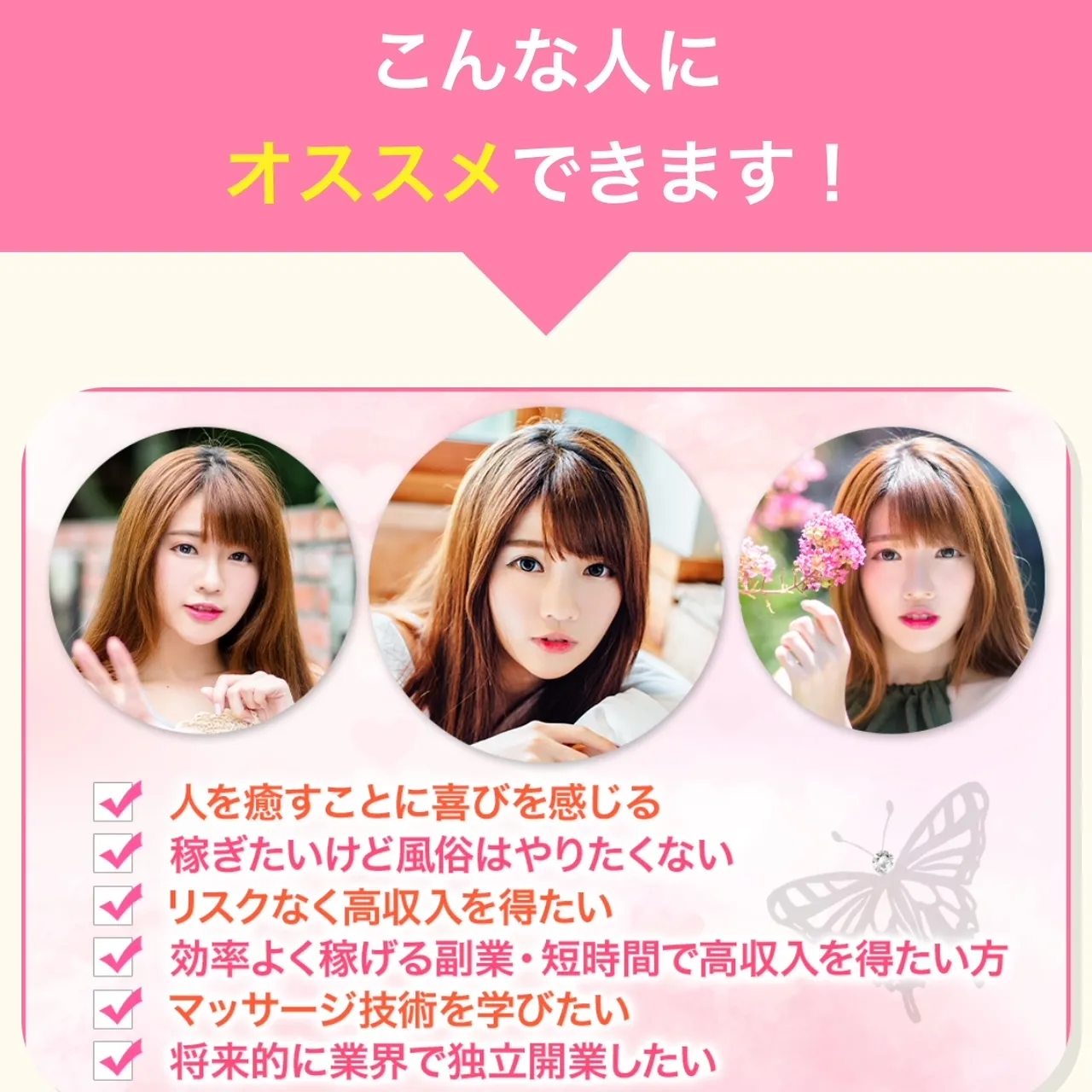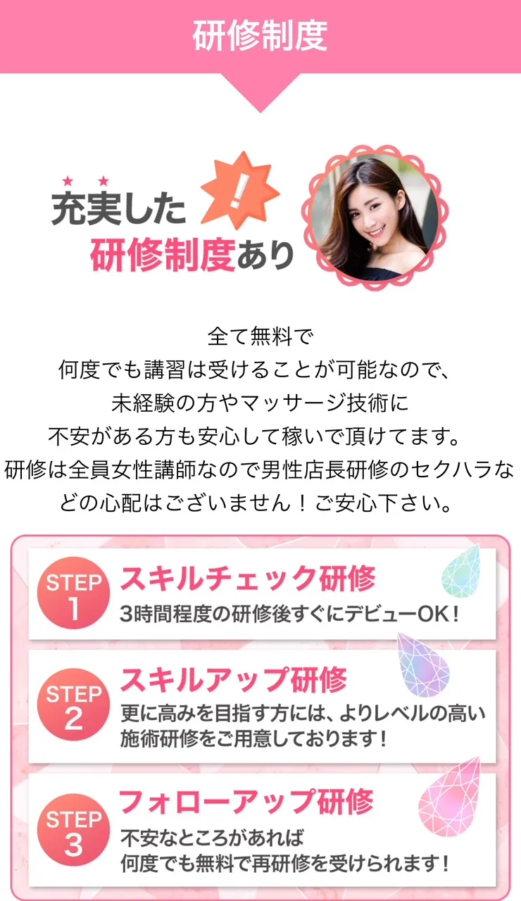 未経験の方はプロ女性講師による施術研修を受けてからデビューになります。(経験者は講習なしでも大丈夫です)