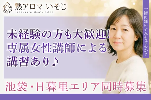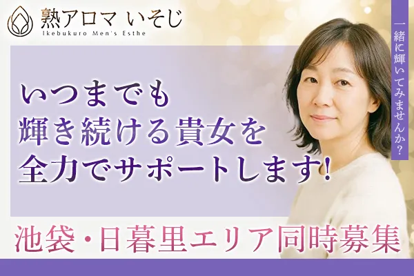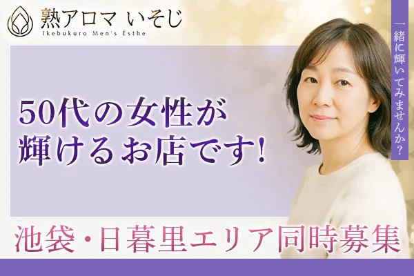 【池袋・日暮里ルーム同時OPEN】50代の女性が輝けるメンズエステサロンです!「熟アロマ・いそじ」は、いつまでも輝き続ける貴女をサポートをしお手伝いすることをお約束いたします。