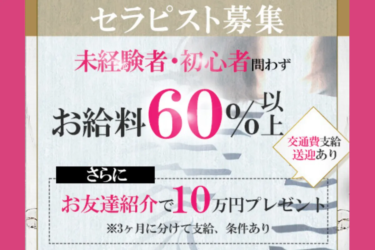 【30代セラピストさんがメインで活躍中】未経験で入店したセラピストさんも沢山活躍しているお店です。デビュー前の研修はもちろん、完全に女性が安心できるまでしっかりアフターフォローしてもらえるところが嬉しいポイント◎只今お友達紹介で10万円プレゼント中なので、ぜひお問い合わせくださいませ✨