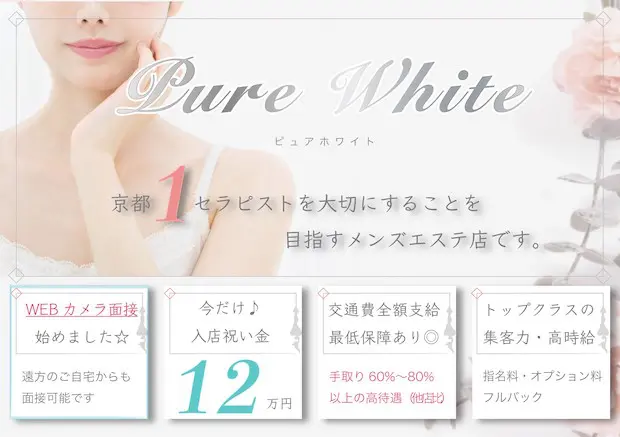 経験者の方も未経験者の方もしっかりと稼いでいただける様々なシステムをご用意しております。 きっとピュアホワイトを選んで良かった、ピュアホワイトで働いてよかったと言っていただけると思います。運営スタッフも気さくで優しいスタッフばかりです。不安な事・分からない事なんでもご質問ください。