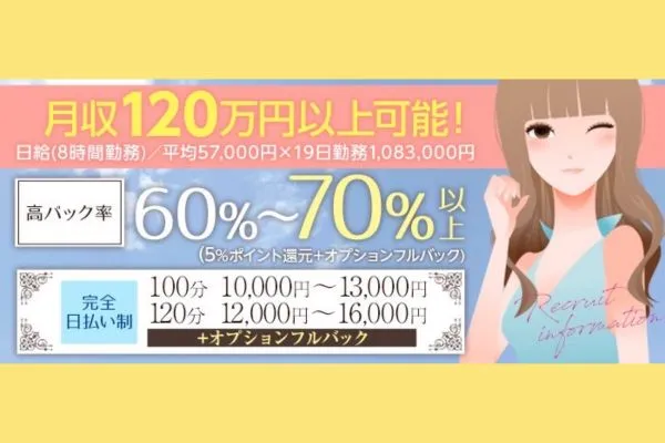 ★35歳くらいまでの方、経験者優遇・未経験者大歓迎★本指名・オプションフルバック♪実績によりフリーでも60%以上可能!安心の日給保証もあり◎改装したばかりの綺麗なお店です。面倒なタオルの洗濯は業者に依頼、ルームの準備も楽ちん♪疑問・質問なんでもご相談ください!