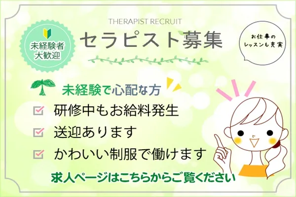 顧問弁護士監修のクリーン営業。過激な衣装はありません。顔出しNG、出張NGでも問題ありません。バック率50%〜最大80%!安心の保証給あり◎個室待機でストレスフリー◎郊外でも無料送迎可能、店泊もOKです。★30代のセラピストさん活躍中★