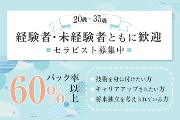 ★30代の人気セラピストさん活躍中★バック率60%以上、指名料は全額還元!未経験の方でも無料の研修制度がありますのでご安心ください。週1回、月1回の出勤でもOKです。本町駅・淀屋橋駅から徒歩5分圏内の便利なお仕事場です♪