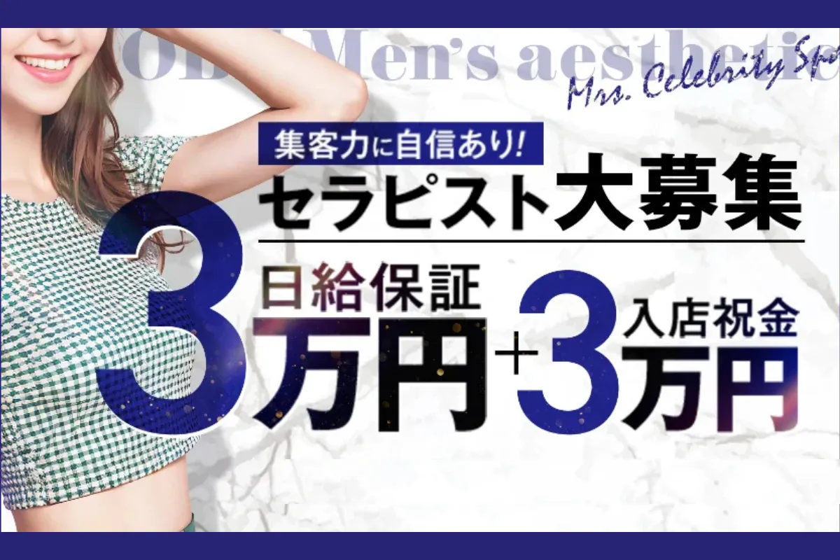 【30代・40代セラピストさん活躍中!!】大阪各エリアにルームと出張で展開しているミセス専門店。最高バック率は70%+指名料は嬉しいフルバックで100分13,900円に!!最大5万円の日給保証があるので安心して働けます。出張コースでも手当てがあるのも嬉しいポイント♪