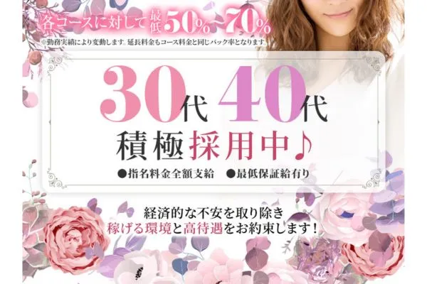 大人の魅力が際立つ30代~40代の女性がセラピストとして輝けるミセス専門店です。経験問わずどなたも活躍できる環境が整っています。バック率60%~80%という業界トップクラスの報酬であなたの頑張りをしっかり評価!!昇給もあるのでモチベーションを保ちながら働き続けることができます◎