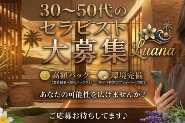 30-50代のセラピストさん募集中!90分最大13,000バックの好条件でお仕事しませんか?経験者の方・好待遇積極採用中! 一緒にお店を作り上げていって下さる経験者の方のご応募をお待ちしております。業界未経験の方も大歓迎!