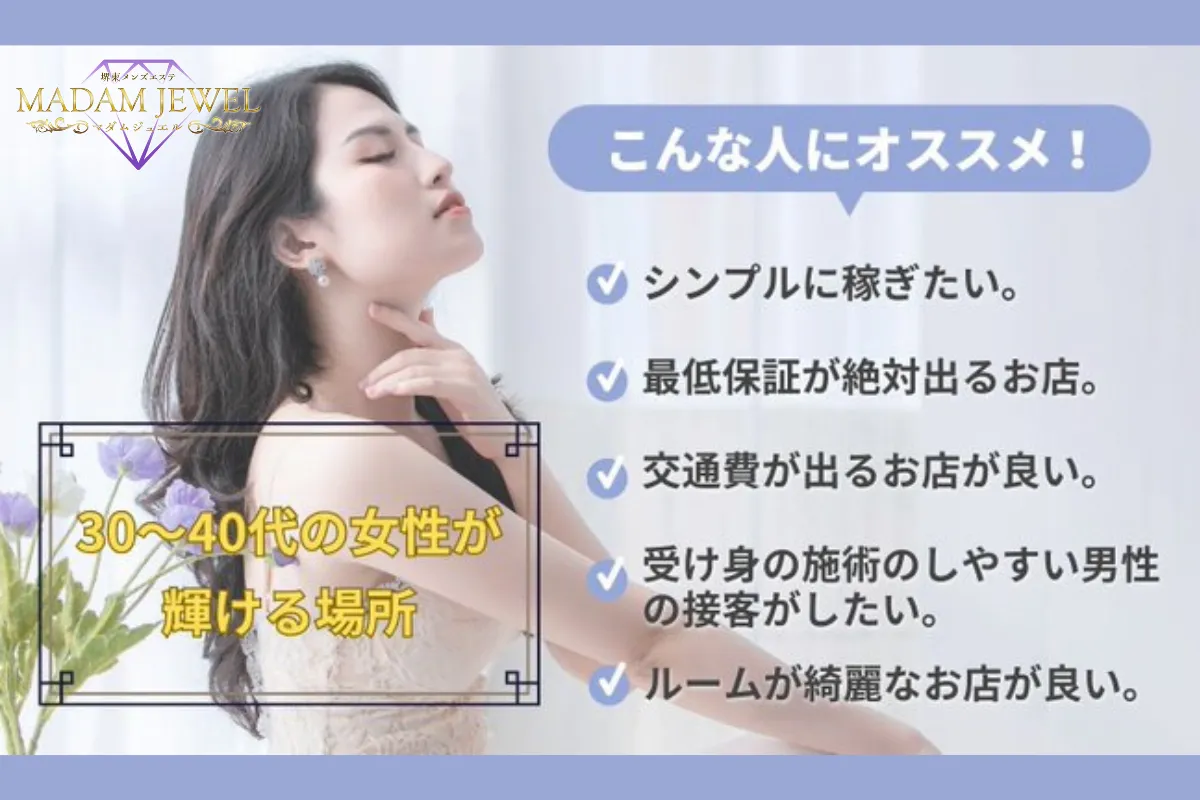 【30代・40代セラピストさん活躍中!!】大阪各エリアにルームと出張で展開しているミセス専門店。最高バック率は70%+指名料は嬉しいフルバックで100分13,900円に!!最大5万円の日給保証があるので安心して働けます。出張コースでも手当てがあるのも嬉しいポイント♪