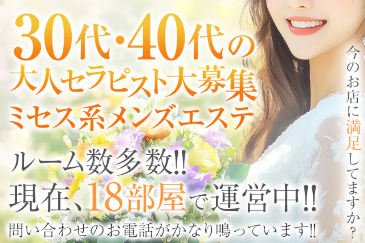 【30代、40代セラピストさん活躍中】2025年3月のオープン以降順調にルーム展開中!!今勢いのあるミセス専門店です。経験者の方はもちろん、未経験の方のご応募も大歓迎!!面接は24時間受け付けているので深夜でもいつでもお問い合わせください♪