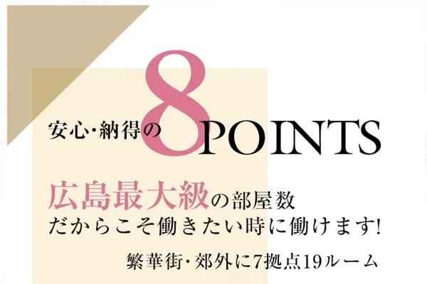 20代~30代のセラピストさんが活躍中。広島最大級の部屋数で短時間でも大丈夫。未経験の方にも親身に対応します!