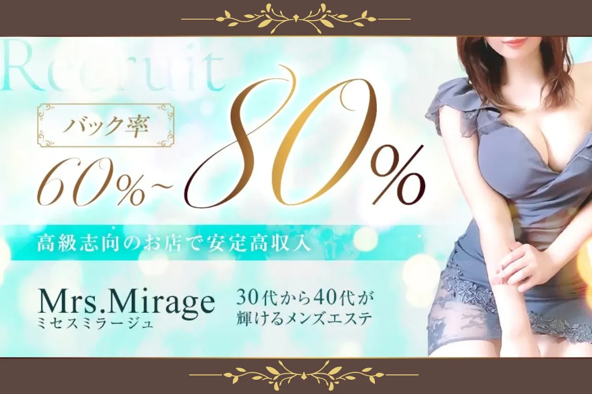 30代~40代を中心とした大人の女性の稼ぎ場として多くのセラピストさんに選ばれてきたミセス専門店です。70%の最高バック率+フルバックの指名料で100分13,900円の収入も◎最大5万円の日給保証付きで高収入と安心感を両立させました♪