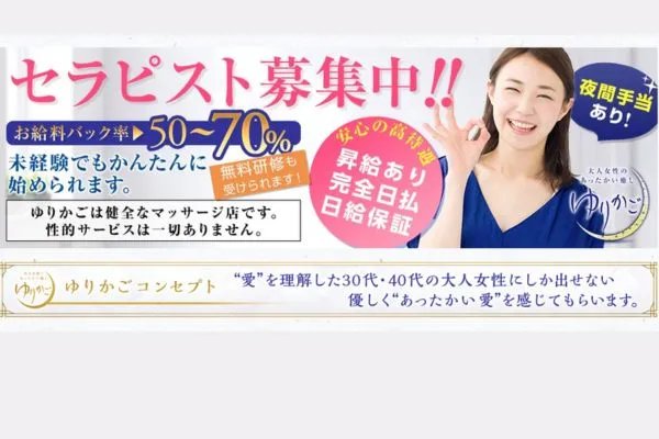 30代40代がメインで活躍中、未経験者も大歓迎!女性スタッフ中心の優良店舗です。セラピストさんを全力でサポート。綺麗で清潔なルームで気持ちよくお仕事してください。バック率70%も可能!